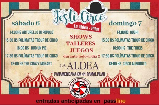 Espectáculos de compañías de circo nacionales con trayectoria internacional. Shows de trapecios a vuelo a 8 metros de altura. Talleres de malabares, acrobacias, equilibrios y acrobacias aéreas. Grandes artistas itinerantes anfitriones acompañaran e interactuarán con los visitantes durante toda  la jornada. Todo esto sucederá en Festi Circo un evento organizado por Circolocirco y La Aldea Pilar para que grandes y chicos puedan disfrutar de un día al aire libre en un entorno relajado y natural.
