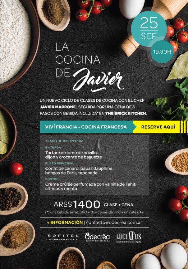 Se hará en el hotel Sofitel Buenos Aires donde su chef Javier Marrone preparará un menú especial que tendrá un costo de $1400 la clase de cocina y la cena.