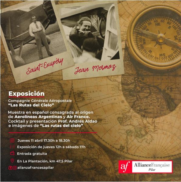 La Alianza Francesa de Pilar invita a usted al vernissage de la exposición L’Aéropostale, Compagnie Générale Aéropostale, “Las rutas del cielo” muestra en español consagrada al origen de Aerolíneas Argentina y Air France